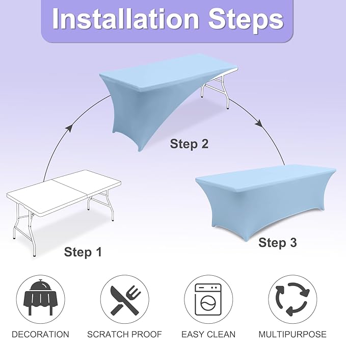 - 3.Which One Should You Choose?: Whether you're using for everyday use in your home or in commercial establishments such as restaurants, hotels and cafes. Our inexpensive rectangle spandex table covers which have the size of 4FT, 5FT, 6FT, 8FT and multicolor will match your table and decor perfectly. Table covers in multipacks are even more cost effective because after taking into account the cost of packaging and transportation.
