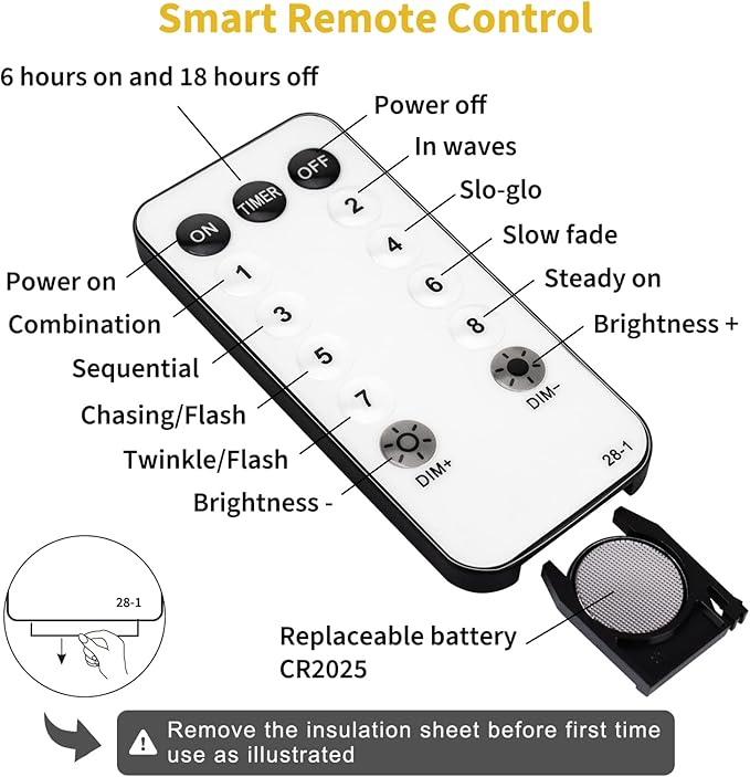 - 8 lighting modes and timer function and dimmer: The lights have 8 lighting modes: Combination, in waves, sequential, slo-glo, chasing or flash, slow fade, twinkle or flash, steady on; the lights also have a memory function that allows you to set your specific mode and use the timer function on the remote to turn on the lights for 6 hours and off for 18 hours automatically every day; set the brightness by dimmer to adapt to special occasions like dating, wedding, anniversary or birthday party