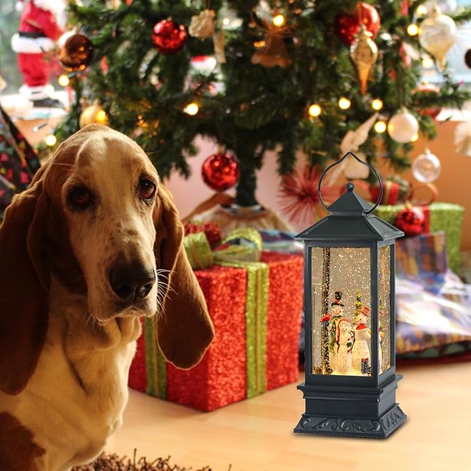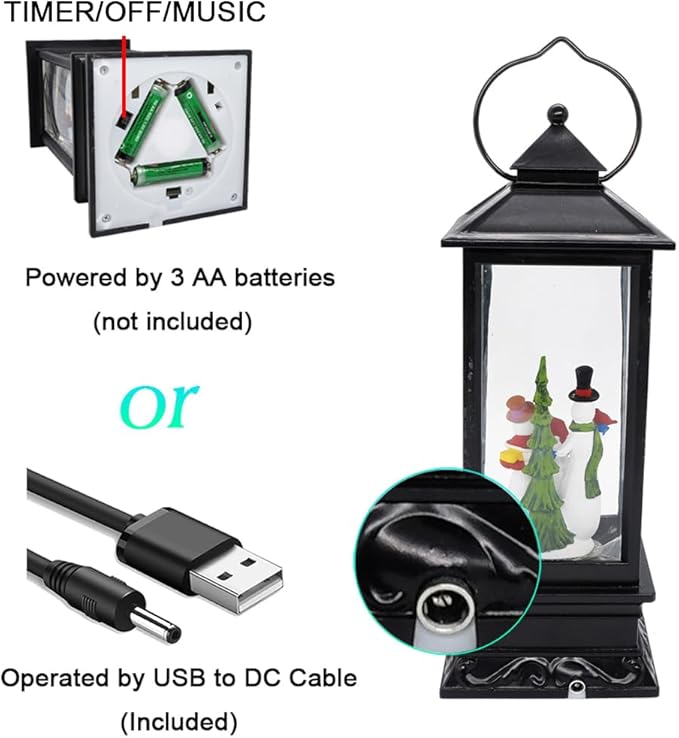 - ★WHAT YOU WILL GET: You will get 1 pcs Musical Water Snow Globe Lantern in black color finish, which can be operated by USB cord (included) or 3 AA batteries( not included). Product dimension is 4" x 4" x 12"