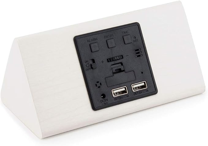 - MULTI-FUNCTION: Updated version for 7 levels of brightness adjustable display. Sound control function with acoustic sensor, displays time, date, month, year, temperature (°F), humidity(%RH), and alarm clock functions with LED lights that glows through the marble pattern finish. There are 2 USB output ports on the back (5V, 1A) that allows charging for Android or Apple system smart phones at the same time.