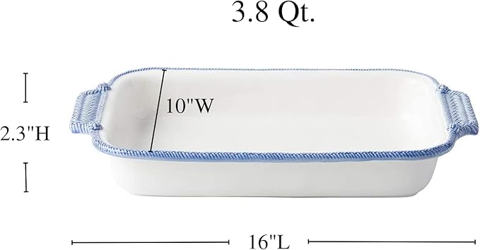 - SOPHISTICATED DESIGN: Le Panier White/Delft Rectangular Baker has a sophisticated and unique design. Made in Portugal and measures 10.0"W x 2.3"H x 16.0"L. 3.8 Qt capacity.