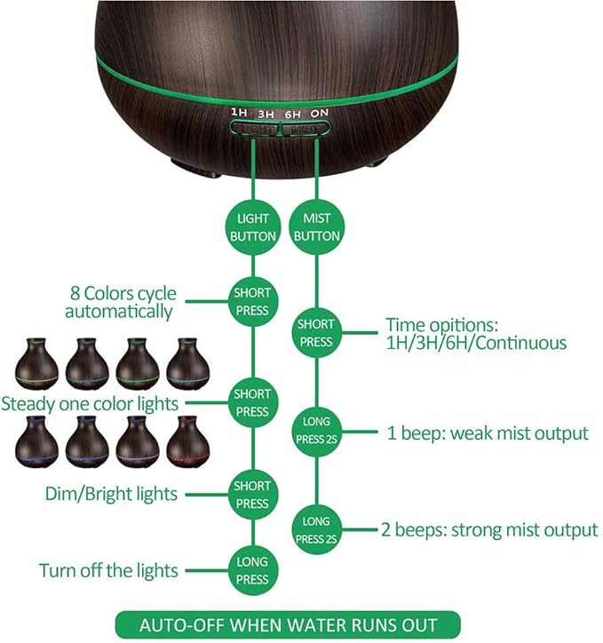 - EXCELLENT SAFETY --It has a timer setting and spray control, with an automatic extinguish function without water. You can continue to use this aromatherapy diffuser at night without worrying about overheating as it has a waterless auto shut-off function to ensure the safety of you and your family. You can also change the light according to your preference by choosing different light modes and timer setting. The three-time setting for option: 1/3/6H timer.