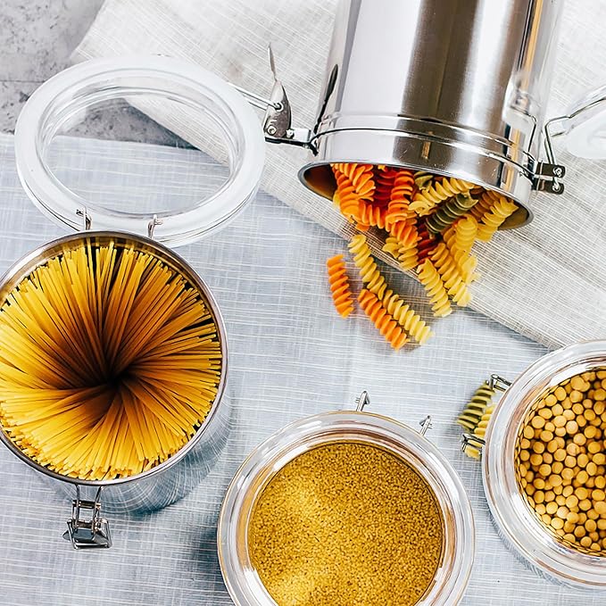 - Sweet Design --- Clear clamp lid allow to easy viewing of canister contents. With transparent plastic lid, you will save more time. They are great for storing cookies, coffee, flour, sugar, nuts, coarse cereals and more. This practical canisters set is perfect for various occasion including countertop, restaurants, bistros, pubs, cafe, pantry and so on.