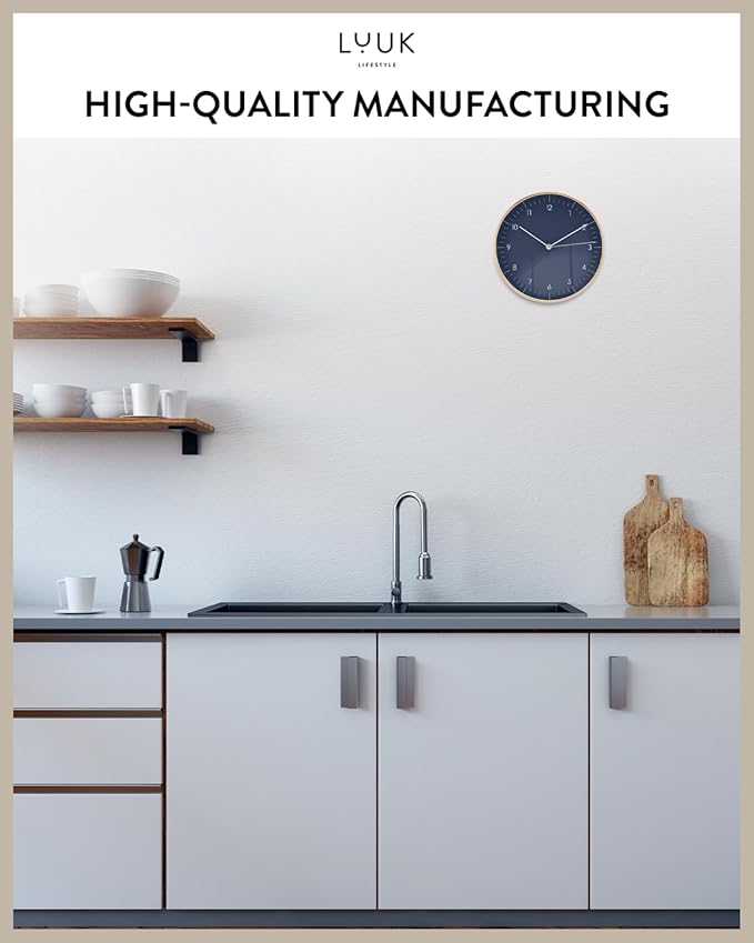- SILENT MOVEMENT: This non-ticking quartz wall clock, elegantly designed in a deep navy blue color, comes with a second hand and embodies a minimalist, Scandinavian design; The Arabic numerals are readable from a distance