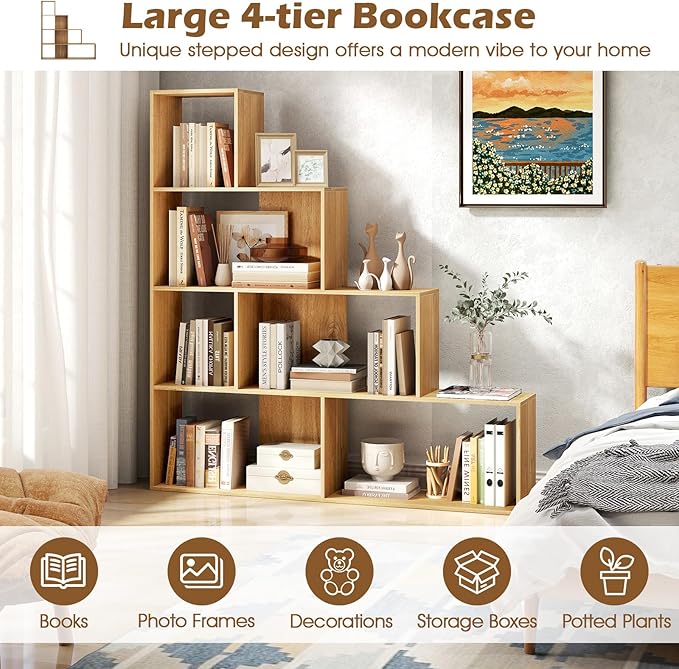 Tangkula 4-Tier Stepped Bookshelf, Freestanding 6 Cubes Ladder Bookcase with Anti-Tipping Kits, 64" Tall Modern Wooden Storage Display Rack for Home Office Living Room Study (1, Natural)