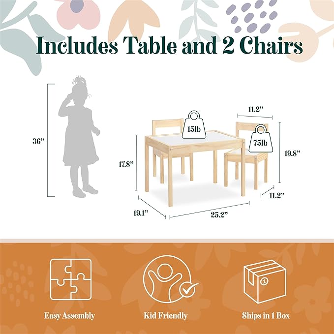 - Sturdy wood construction that includes 1 toddler table and chairs at a kid-friendly height, suitable as a kids table and chairs for any playroom
