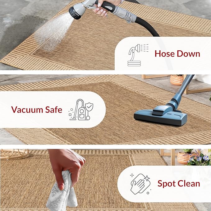 - Easy to clean, this rug can be hosed down outside and spot treated for any mild stains using rug cleaner