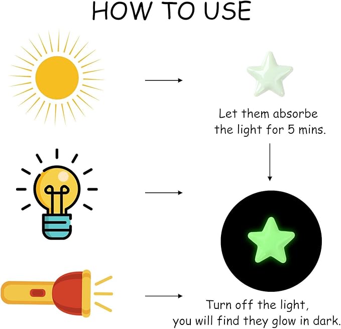 - Attention:These stars need to absorb some light to work, you can put them in the sun, flashlight, lamplight illuminate, only need 5 minutes, they will CREATE A ROMANTIC PANORAMA! Nothing is better than a night under the stars! Nightlights and lamps can’t create the calming and relaxing mood that a sky full of stars delivers.