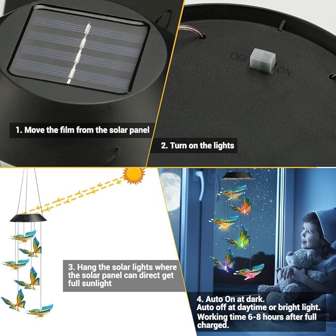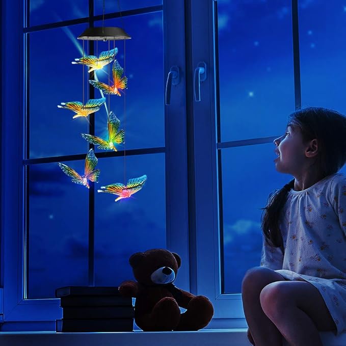 - 【Solar Powered Wind Chimes】 Featuring a unique design with 6 butterflies shaped lights charge automatically in the daytime and light up at night, free your hands, new version solar panel absorbs energy quickly, the solar Christmas lights can last up to 8-10 hours after fully charged.(Christmas Lights, Christmas Decorations, Easter Lights, Easter Decorations, Gift for Mom, Gifts for Wife, Gifts for Grandma, Mom Gift, Grandma Gift, Birthday Gift for Mom, Birthday Gift for Grandma)