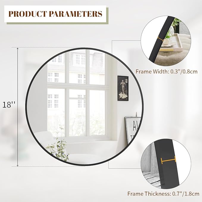 - Modern Brushed Frame Design: 18-inch black circle mirror is crafted of an aluminum alloy metal sleek frame, making it ideal for bathroom mirror, entrance mirror, vanity mirror, living room mirror