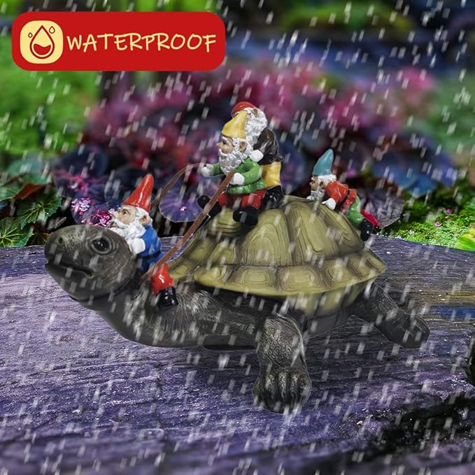 - Unique: Colorful gnomes are driving a turtle with a rope.