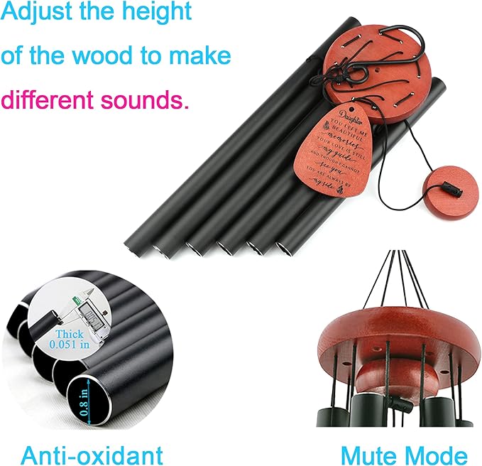 - Premium Quality Memorial Wind Chimes: Made with high-quality aluminum tubes and a corrosion-resistant black anodized finish, these memorial wind chimes produce clear, beautiful tones. The bell holder, striker, and wind catcher are made from durable beech wood, and the entire structure is supported by a strong, weather-resistant nylon cord for lasting outdoor use