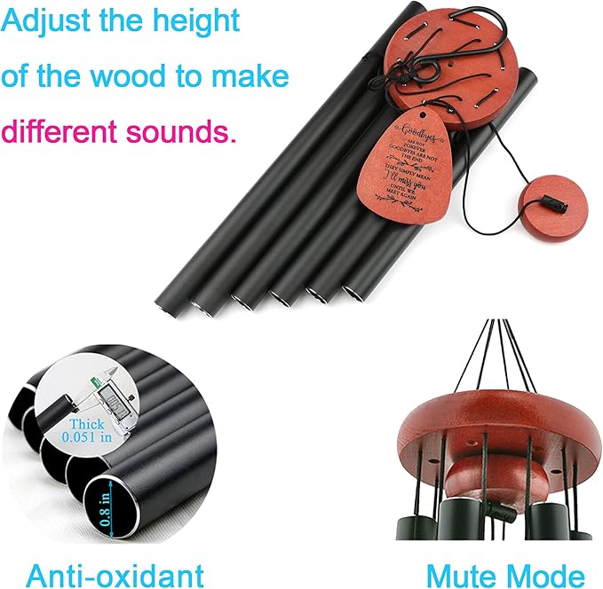 - Premium Quality Memorial Wind Chimes: Made with high-quality aluminum tubes and a corrosion-resistant black anodized finish, these memorial wind chimes produce clear, beautiful tones. The bell holder, striker, and wind catcher are made from durable beech wood, and the entire structure is supported by a strong, weather-resistant nylon cord for lasting outdoor use