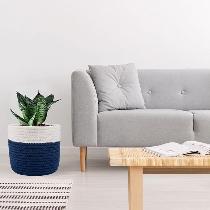 Cotton Rope Plant Basket Woven Baskets for 6" Pot Floor Indoor Planters,Rustic Home Decor H6 3/4" x W6 1/2" White Stitching Navy Blue