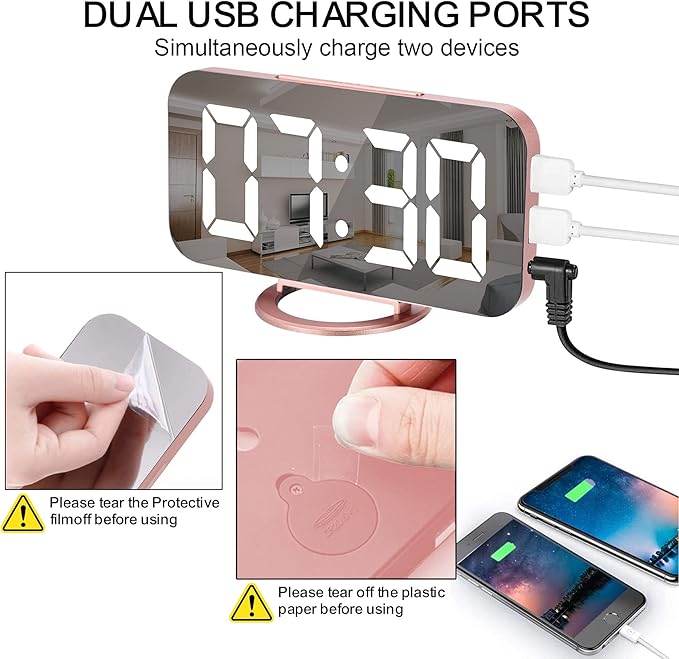 SZELAM Alarm Clock for Bedroom,LED and Mirror Digital Clock Large Display,with Dual USB Charger Ports,Auto Dim,Snooze Mode,Modern Desk/Wall Electronic Clock for Girl Woman Mom Teens - Rose Gold