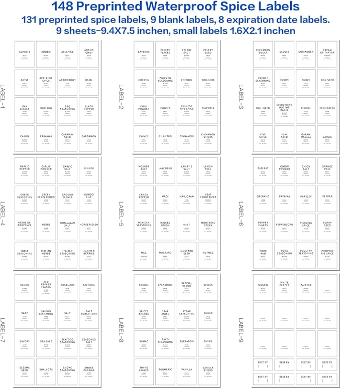 - 【MINIMALIST-WATERPROOF SPICE LABELS】Our glass spice jar labels include 131 preprinted spice labels, 9 blank labels, 8 expiration date labels. These spice stickers are high contrast for easy reading. Vinyl labels are preprinted on water resistant white matte backing that won't peel off or tear, can be removed and replaced. Perfect fit 6oz spice organizer jars.
