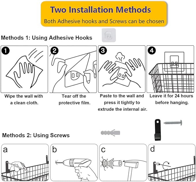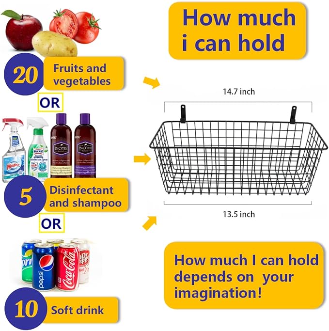 - 🍎【Sturdy wire baskets that can hold 50 pounds】 These baskets are made of durable steel wire with durable anti-rust and anti-corrosion coating, as well as wall-mounted hardware and hooks, which can hold 50 pounds. (Note: If you use non-marking paste instead of screws, the basket can hold 11 pounds)