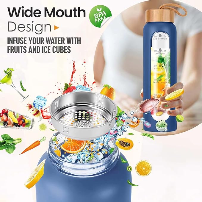 Aqulea Glass Water Bottles 32 Oz with Silicone Sleeve - BPA Free Reusable Wide Mouth Glass Motivational Water Bottles with Fruit Infuser – Leak Proof Borosilicate Water Bottle with Time Marker (Blue)