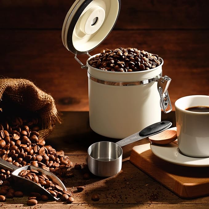 - 【BUILT-IN DATE TRACKER】A simple yet incredibly useful feature! The date tracker lets you monitor when the canister was last filled, helping prevent your coffee from going stale unnoticed. A stainless steel scoop is conveniently attached to the side, so you’re never left searching for a measuring spoon. Features a superior airtight seal for maximum freshness.