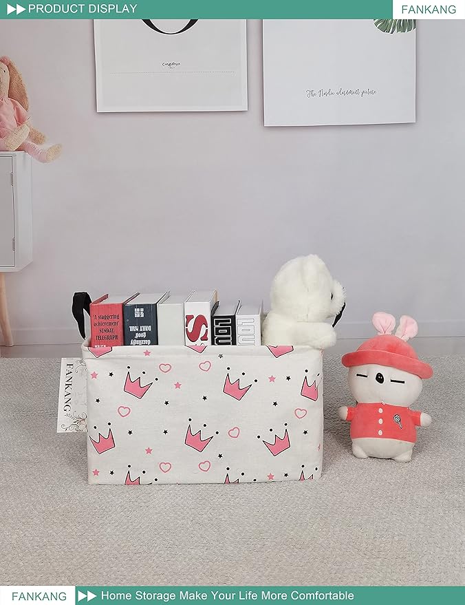 FANKANG Storage Bins, Nursery Hamper Canvas Laundry Basket Foldable with Waterproof PE Coating Large Storage Baskets for Kids Boys and Girls, Office, Bedroom, Clothes,Toys(Rec-pink crowns)