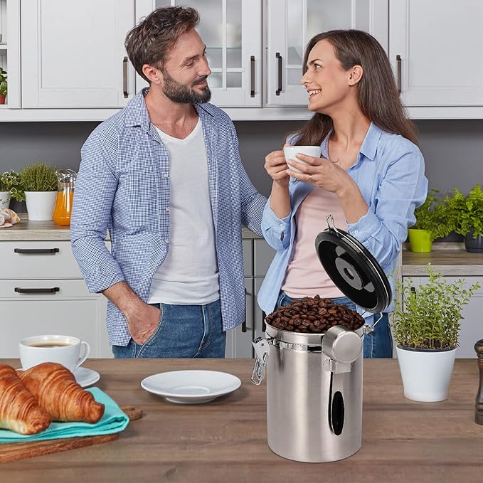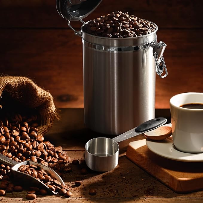 - 【BUILT-IN DATE TRACKER】A simple yet incredibly useful feature! The date tracker lets you monitor when the canister was last filled, helping prevent your coffee from going stale unnoticed. A stainless steel scoop is conveniently attached to the side, so you’re never left searching for a measuring spoon. Features a superior airtight seal for maximum freshness.