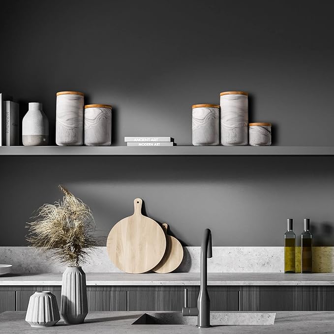 - [Airtight Ceramic Kitchen Canister]: Made of porcelain, lead-free, and lightproof.The silicone seal ring of the wood lid makes the white kitchen canister air-tight. To be sure they’re airtight, you’ll hear that satisfying “pop” when you open the sugar canister!