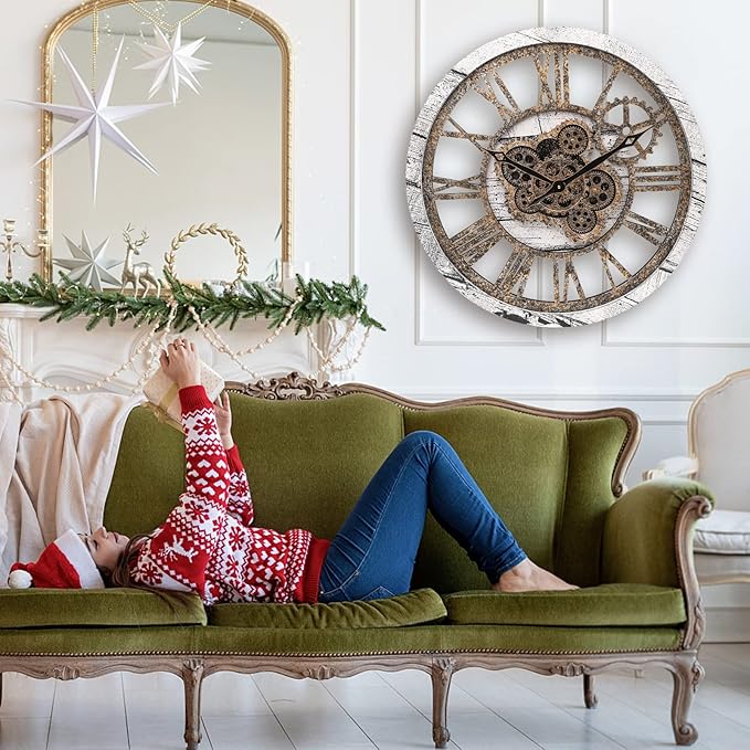 HOIBAI Large Wall Clock, 20 Inch Wall Clocks for Living Room Decor Farmhouse Vintage Rustic Kitchen Wall Decor Vintage Roman Big Oversized Wall Clock for Home Bedroom House Office, Moving Gears Clock