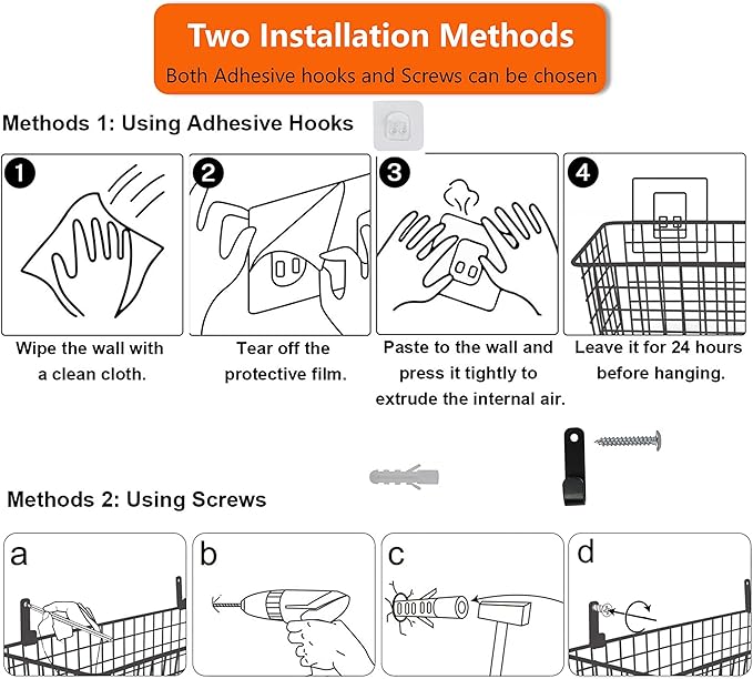 - 🍎【Sturdy wire baskets that can hold 40 pounds】 These baskets are made of durable steel wire with durable anti-rust and anti-corrosion coating, as well as wall-mounted hardware and hooks, which can hold 40 pounds. (Note: If you use non-marking paste instead of screws, the basket can hold 10 pounds)