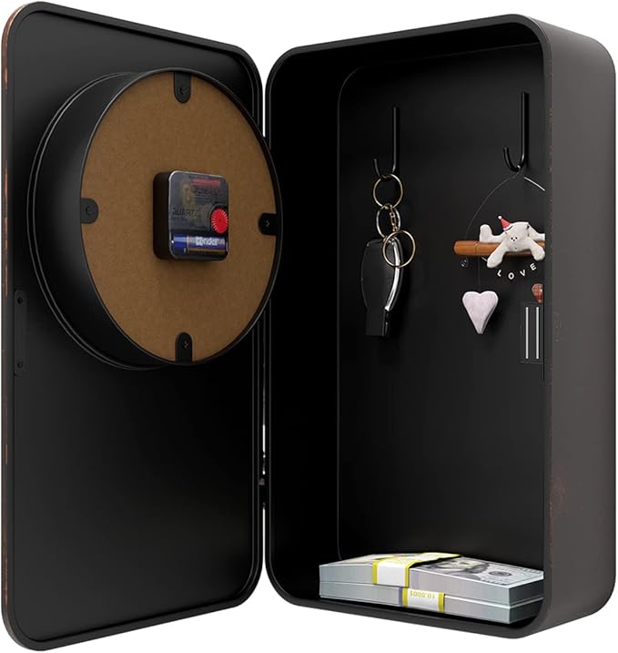 - WALL CLOCK DETAILS : Abdurey hand crafted, the case frame is cut from thick steel plate and baked with lacquer to prevent rusting, the hands are made of aluminum and the lens is a high definition tempered glass lens that is easy to clean and keeps dust away from the dial. The 2-slot design on the back provides easy mounting with just 2 seamless hooks (included) for simple hanging and easy opening and closing of the safe.