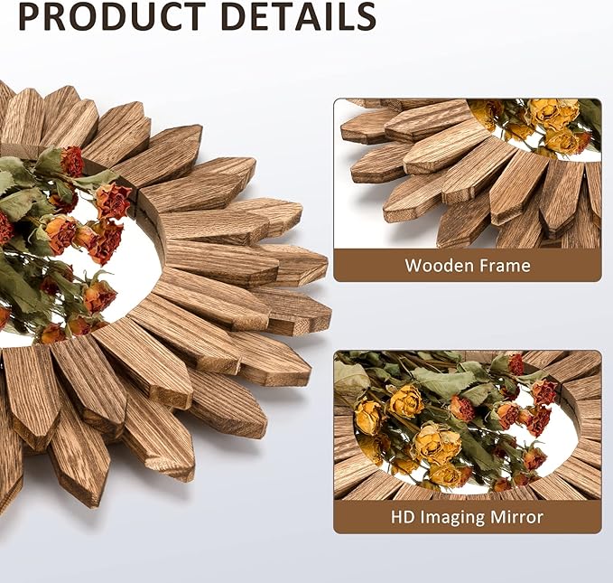 - Boho Wall Decor Mirror: The design of wood sunburst base on the element of boho style, it will be a nice touch and goes well with your others boho decor style; decent decorative piece with perfect size for wall mounted or lean on wall at desk, perfect for your bedroom, living room, bathroom, kitchen and more