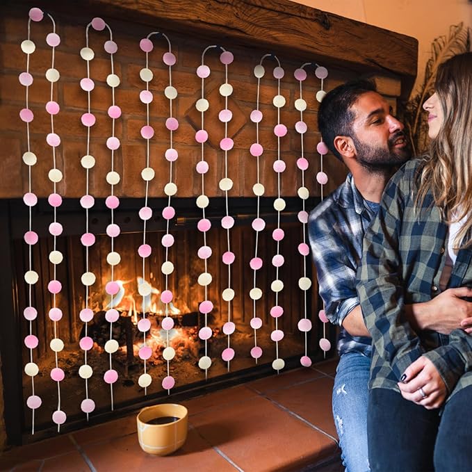 - OCCASIONS: Vintage modern style cute kawaii lovely special design, adding a warm rustic feel. It's easy to hang and can be hung anywhere, perfect funky eclectic decor for home, office, kids playroom, students classroom. The Pink Pom Pom Garland is a great Christmas decorations for indoor home, outdoor yard garden, living room, bedroom, stair railing, fireplace, ceiling, wall, door, window, gift basket, tree, mantle.