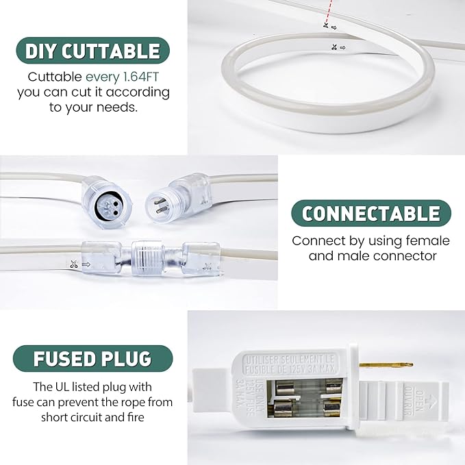 - Cuttable & Connectable--GZBtech AC 110-120V LED neon rope light can be cut in every 20inches/0.5m along the cutting marks, you can cut it according to your needs. By using male and female end-to-end for easy connection,plug and play without wiring. This is a 0.31''(W)x0.63" (H) heavy-duty rope light. If you need a smaller neon strip with higher lumens, please click visit the store on the top of this page to view it.