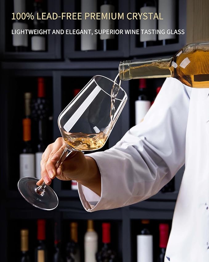 - PURE CRYSTAL: The wine glasses have been certified by the United States and Europe, and is made of high-quality titanium material, which makes the glass light and thin, with a weight of only 0.27 pounds, making it lightweight and beautiful. The crystal wine glass is clear and transparent, and makes a crisp and pleasant sound when clinked. It also helps to retain the aroma of wine, providing a unique drinking experience and pleasure