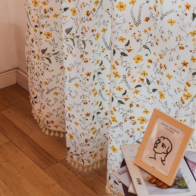 Sutuo Home Boho Curtain Semi-Blackout Yellow Florals Print Cotton Linen Fabric, Handmade Tassels Rod Pocket Bohemian Farmhouse Country Window Drapes for Living Bedroom, 59" W x 84" L, 1 Panel