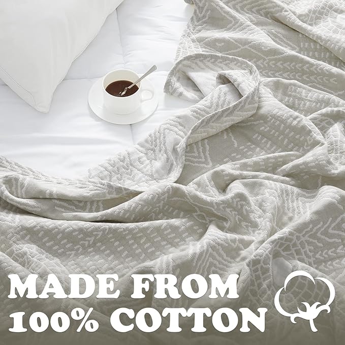 JINCHAN Boho 100% Cotton Muslin Blanket 3-Layer Queen Size 80x90 Inches Geometric Light Grey Lightweight Reversible Soft Comfy Throw for Couch Sofa Bed Coverlet Quilt Large Blanket Bedroom All Seasons