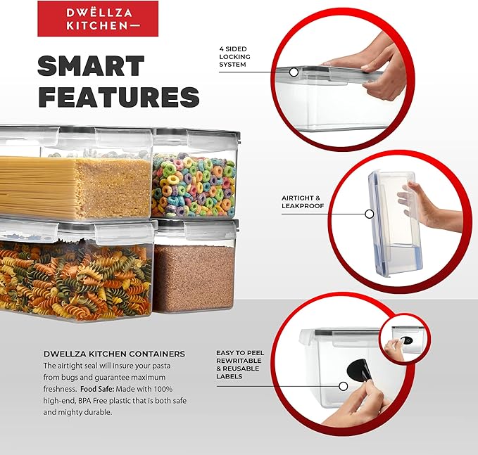 - Airtight Seal: These pasta containers for pantry are designed with an airtight seal that will safeguard your pasta from bugs and guarantee maximum freshness. The rubber gasket of our pasta containers keeps out air, so your foods in it may taste just like the day you open after a few months. The side-locking lids are thick and easy to snap on and off.