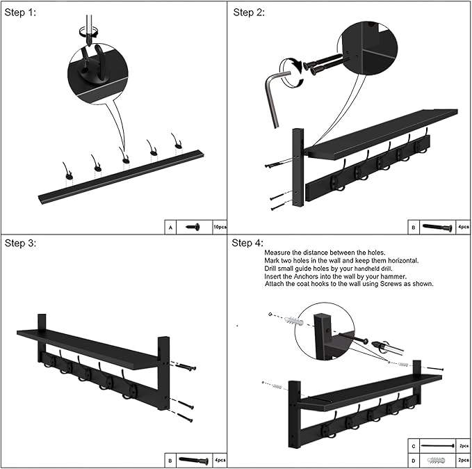 - DIY installation: The necessary mounting hardware (screws and anchors) are included; There are pre-drilled mounting holes on the coat rack hooks; You only need to drill holes in the wall according to the instructions, and you can easily install it on the wall; Enjoy the fun of assembling with your family and friends