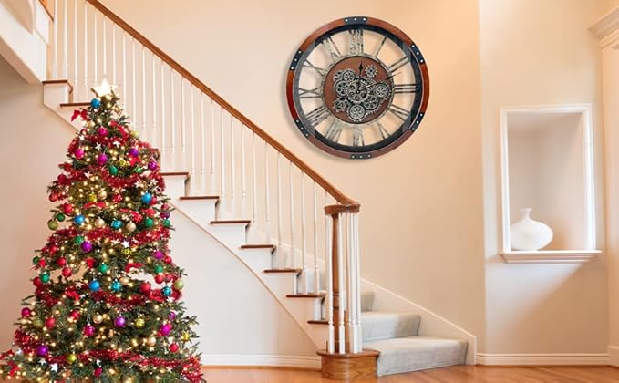 - Unique Design, Only For Your Home: Round solid Wood frame and classic retro skeleton with real mechanical moving gears in the central, the wooden frame is handcraft, showing unique attractive wood grain color and small natural knots; artificial rust-imitated treatment marks on the skeleton for vintage and industrial effect; stronger tempered glass resists any breakage and keeps safety whenever; The design is very different from other clocks, just to break the ordinary, only for your home