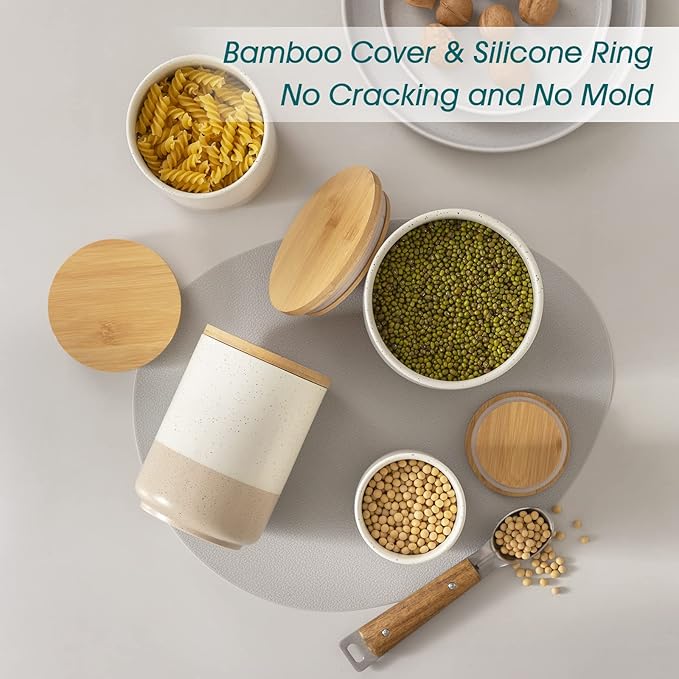 - 【High-quality Material】The canisters are made of high-quality terracotta, which is not easy to crack, and is more durable than plastic and glass. The lid is made of bamboo wood, with an environmentally friendly sealing rubber ring to improve the sealing. Effectively keep the items dry and fresh.