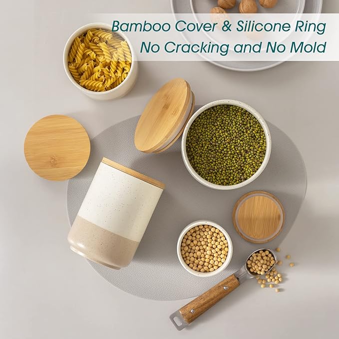 - 【High-quality Material】The canisters are made of high-quality terracotta, which is not easy to crack, and is more durable than plastic and glass. The lid is made of wood, with sealing rubber ring to improve the sealing. Effectively keep the items dry and fresh.