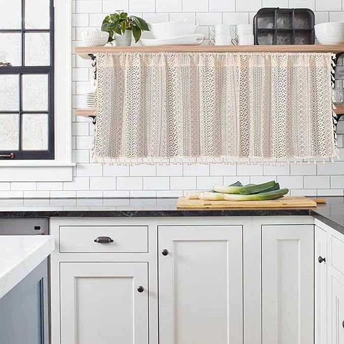 Sutuo Home Boho Sheer Curtain Valance Crochet Lace with Bohemian Hollow Knitted Handmade Tassels, Short Farmhouse Window Treatment for Kitchen Cafe, Rod Pocket, 1 Panel 59" W x 18" L, Beige