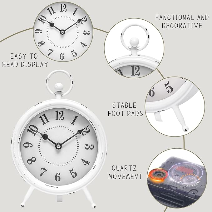 - ✅【HIGH-QUALITY ANTIQUE DECOR】The distressed metal and iron build of this standing small vintage table clock is true to its rustic design. This chic table clock will make a statement with its bright white background, easy-to-read numeral display.
