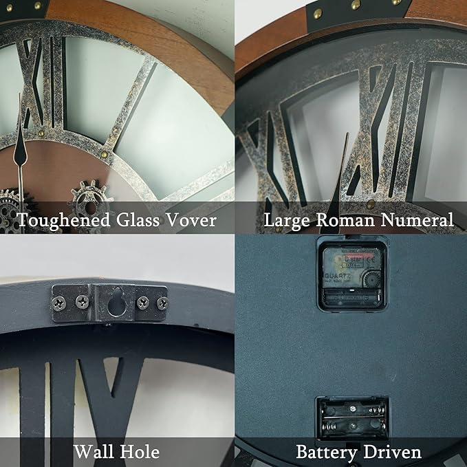 - 🕞Real Rotating Gears: The exposed gears on this large wall clock are real and rotate independently of the pointers. With a dust proof glass cover and battery powered operation, the gears rotate almost silently, providing a unique and dynamic way to experience time.