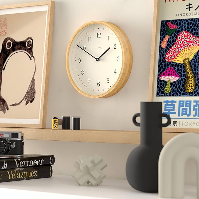 - Minimalist elegance, modern wall clock with a natural bamboo frame, offering a clean, understated design. Glass lens and metal hands.