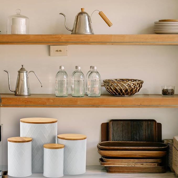 White Kitchen Canisters Set with Bamboo Lids, Airtight Sugar, Flour, Coffee, Cookie Storage Canister Sets for kitchen Countertop, Farmhouse kitchen decor, 4 Pack