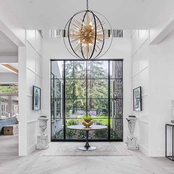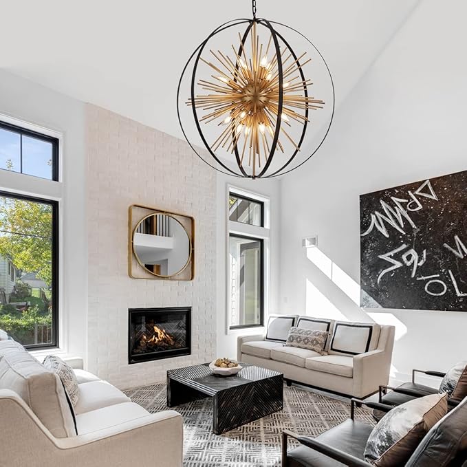 - 【Stylish Design】The Black and Gold Sputnik Chandelier boasts a striking spherical body that resembles a preserved firework, creating a captivating focal point when illuminated. This Modern Chandelier is a perfect addition to a variety of settings, including living room, kitchen island, dining room, hallway, stairway, entryway, as well as cafe and restaurant. Add a touch of elegance and style to your space with this unique and charming Gold Chandelier.