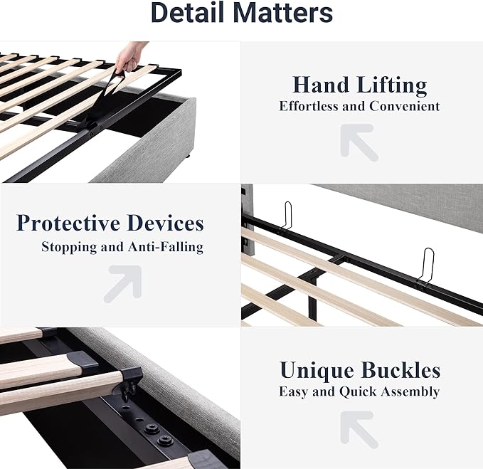 - Space-Saving Storage: With its lifting up storage feature, this bed frame provides ample space to store extra bedding, clothing, shoes, and other items, especially helpful for smaller bedrooms or apartments where storage space is limited