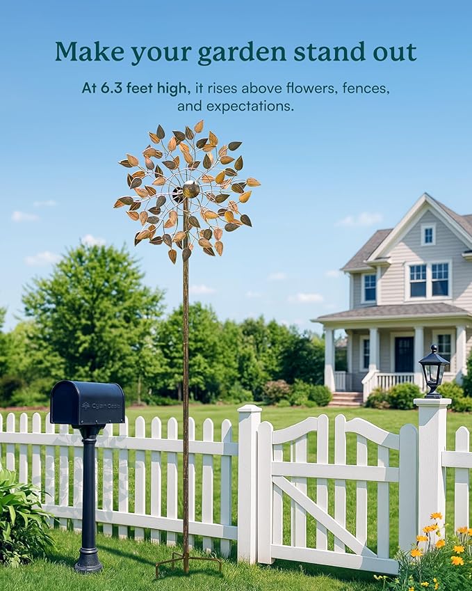 - BEAUTIFUL LEAVES DESIGN: This stunning metal yard spinners features a lovely copper finish and round design. Dual rotors spin independently and rotate 360 degrees. The kinetic yard wind spinners has thickened poles (diameter 22mm, 40% thicker than others) and stable metal stake with three prongs to ensure its firmly planted for windy days and against a snowy landscape.