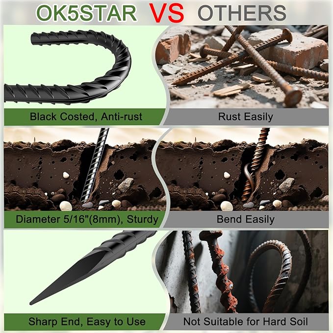 - Strong and Sturdy: Curved rebar stakes are made of heavy duty steel. 5/16"(8mm) Diameter, j hook stakes is solid all the way, not hollow inside