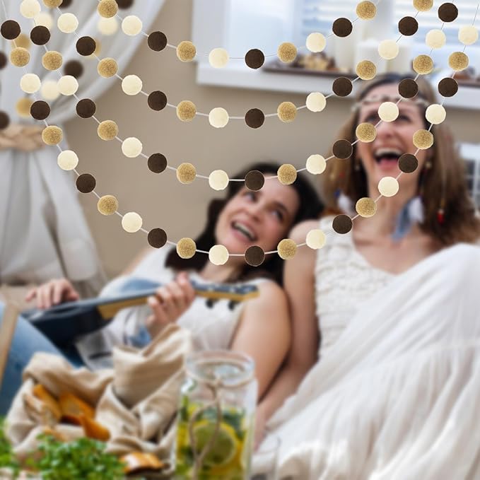 Jishi Pom Pom Garland Boho Party Decorations, 3-Pack Brown Khaki Beige Felt Ball Garland Cute Pastel Rainbow Pompom Strings, Christmas Birthday Wedding Rustic Boho Home Decor Supplies, Xmas Tree Decor